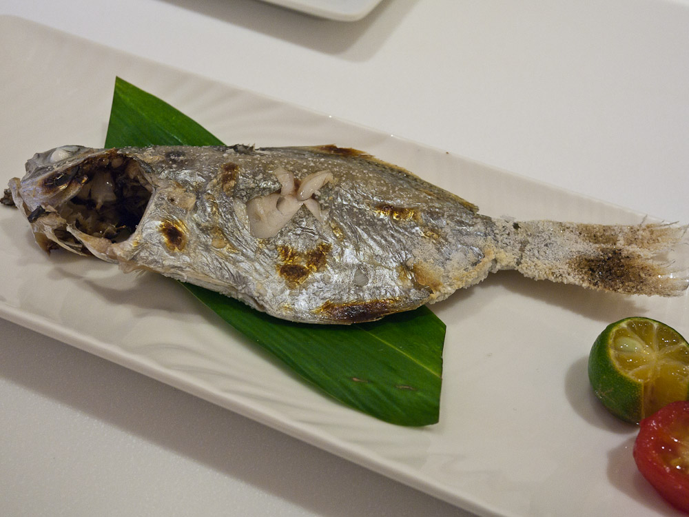 烤紅喉魚, 肉質很Q, 比較有嚼勁, 肉質很韌, 老公公比較喜歡紅喉的口感, 我覺得油鯛鬆鬆的肉質也不錯.
