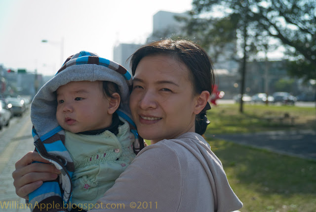 準備帶BB去散步了, 外面雖然出著太陽, 還是稍冷, 所以媽咪將BB全副武裝, 才敢出門.