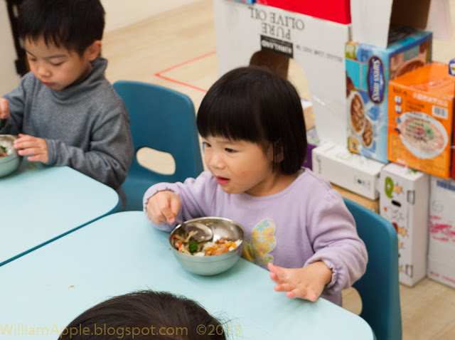 中午用餐, 會先讓小朋友自己先吃, 吃得比較慢的同學, 老師會協助. Julie 不吃青菜, 老師想辦法誘食.